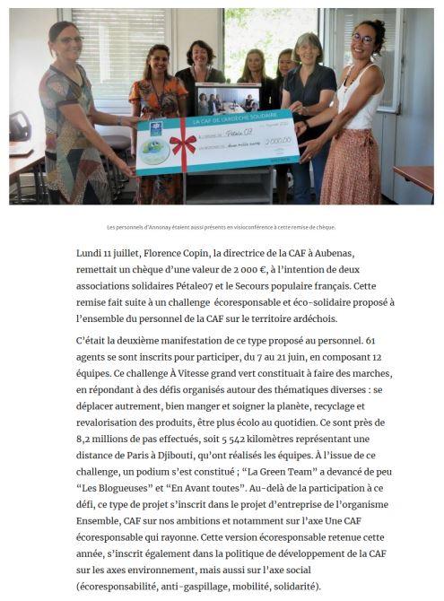 Son challenge « A vitesse Grand Vert » a impliqué une soixantaine de ses agents dans des défis organisés sur diverses thématiques : déplacements, alimentation, recyclage, écologie du quotidien, … A l’issue de ce challenge, 2000€ ont été remis aux associations Pétale 07 et Secours Populaire, pour proposer un programme de 5 animations nature à destination d’enfants issus de familles en situation de fragilité.