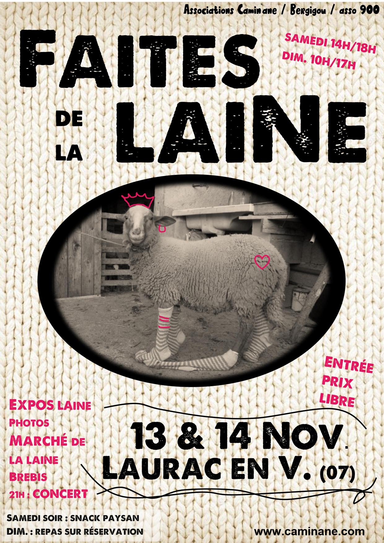 L’équipe de Faites de la Laine organise les 13 et 14 novembre prochain un week-end festif autour d’artisans et d’éleveurs passionnés, des démonstrations de tricot, tissage, teinture végétale, constructions en terre et laine, contes et histoires, concerts, projections, guinguette et repas … Le tout à Laurac-en-Vivarais et à prix libre !