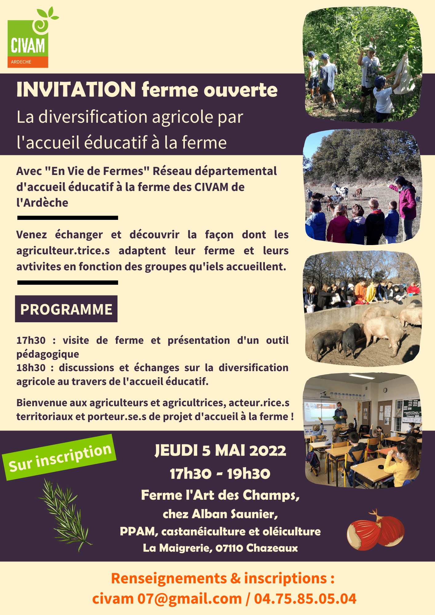 Venez échanger et découvrir les pratiques d’accueil des fermes du réseau En Vie de Fermes le jeudi 5 mai à 17h30 à la ferme l’Art des Champs à Chazeaux .