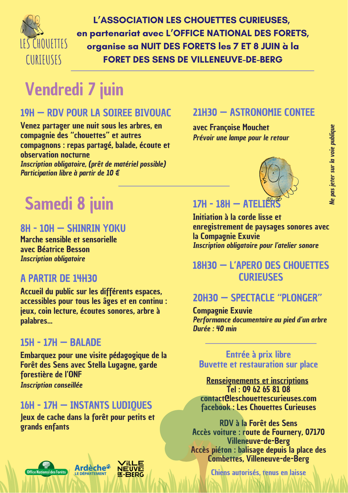 Dans le cadre de ce festival, l’association Les chouettes curieuses, en partenariat avec l’Office National des Forêts propose une programmation les 7 et 8 juin à la Forêt des Sens de Villeneuve de Berg. L’occasion de vivre et partager des expériences multiples dans l’univers de la forêt, de jour comme de nuit : bivouac, balade céleste, balade pédagogique, marche sensorielle et sensible, spectacle et ateliers, jeux de plein air, espace d’expression, coin lecture…