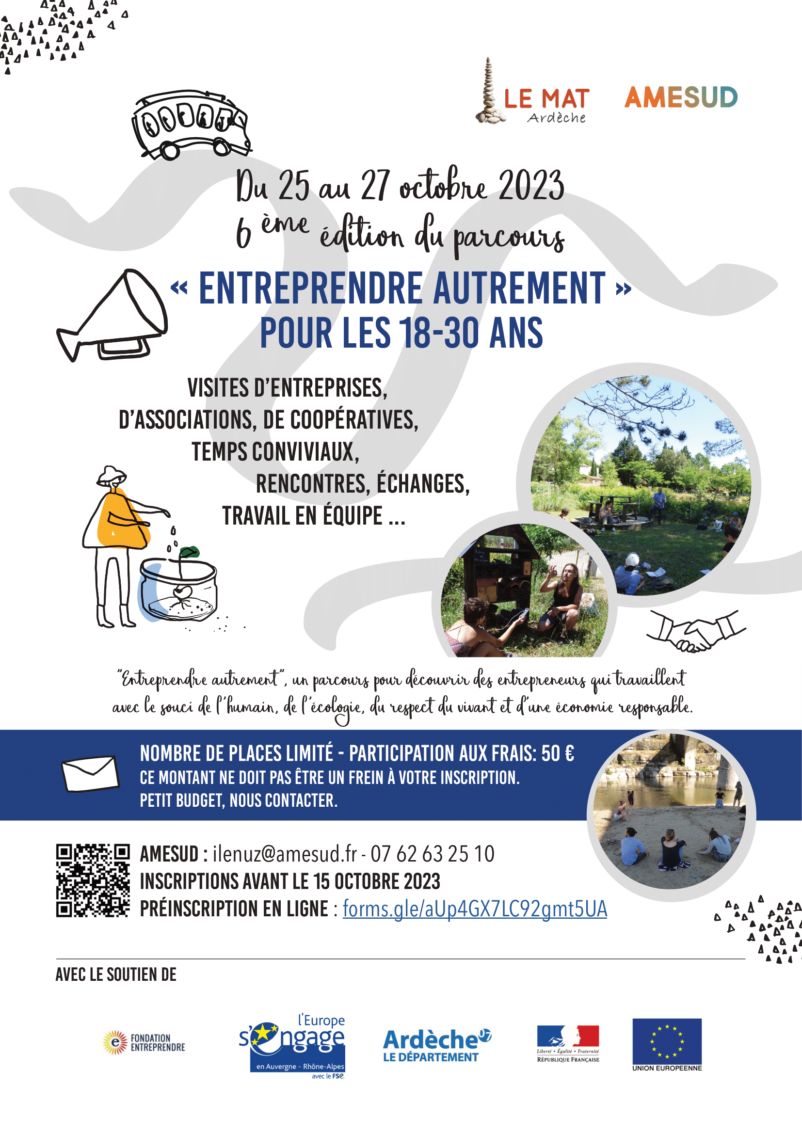 Le pôle ESS animé par Le Mat Ardèche et Amesud, organise pour la 6ème année, une proposition de parcours de découverte « Entreprendre Autrement », à destination des 18-30 ans.