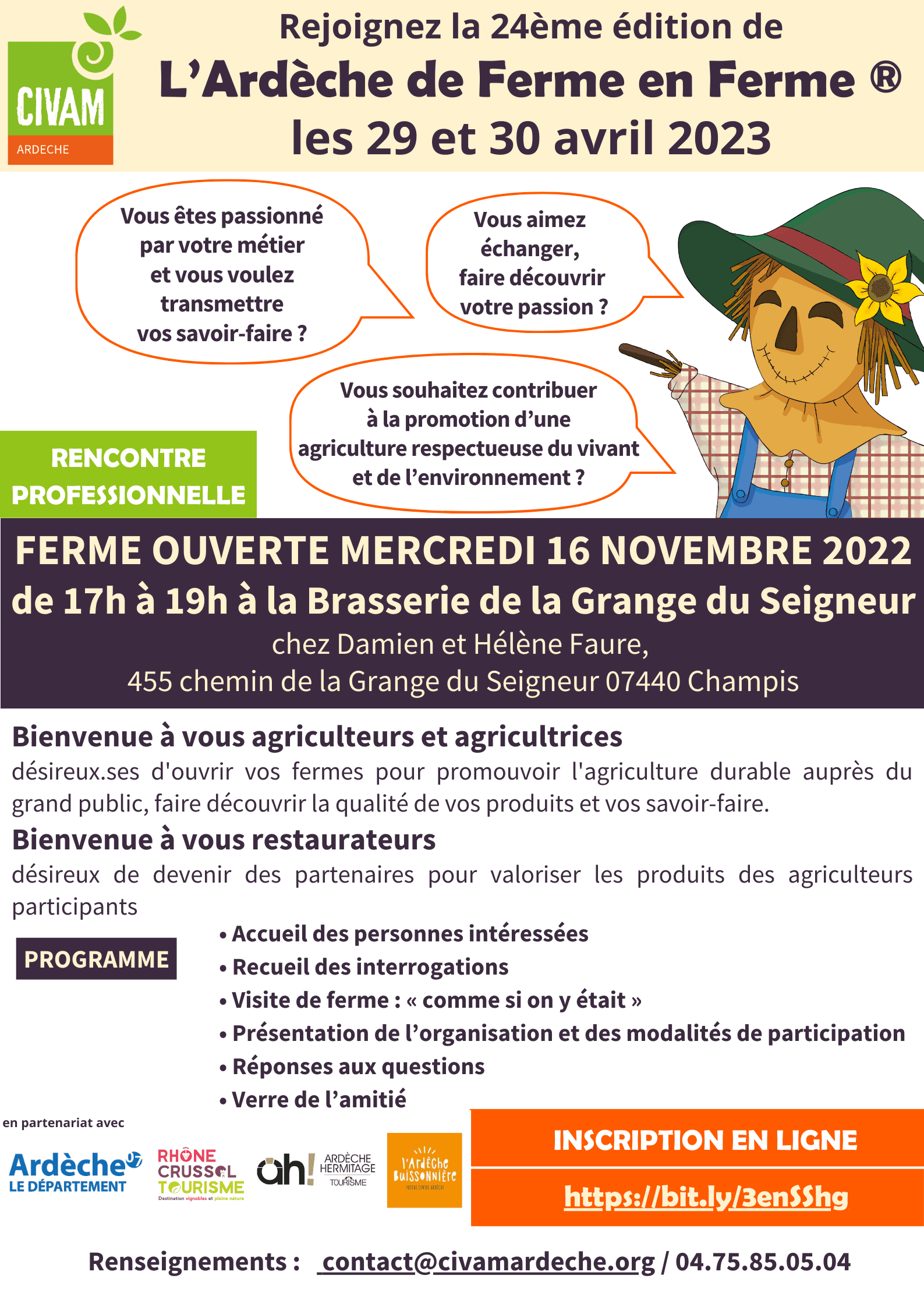Afin de dynamiser l’Ardèche De Ferme en Ferme 2023, la Fédération départementale des CIVAM de l’Ardèche vous convie à une rencontre professionnelle sous forme de visite de ferme afin de vous présenter l’évènement.