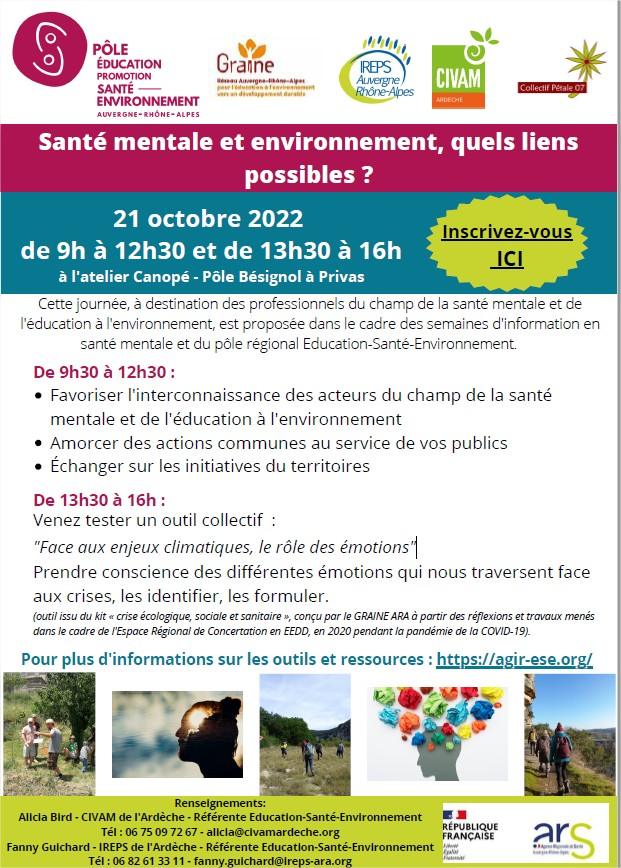 Dans le cadre des semaines d’information en santé mentale et du Pôle régional Education-Santé-Environnement (ESE), les référentes ESE en Ardèche organisent le 21 octobre à Privas une journée à destination des professionnels du champ de la santé mentale et de l’éducation à l’environnement sur le thème « Santé mentale et environnement, quels liens possibles ? »