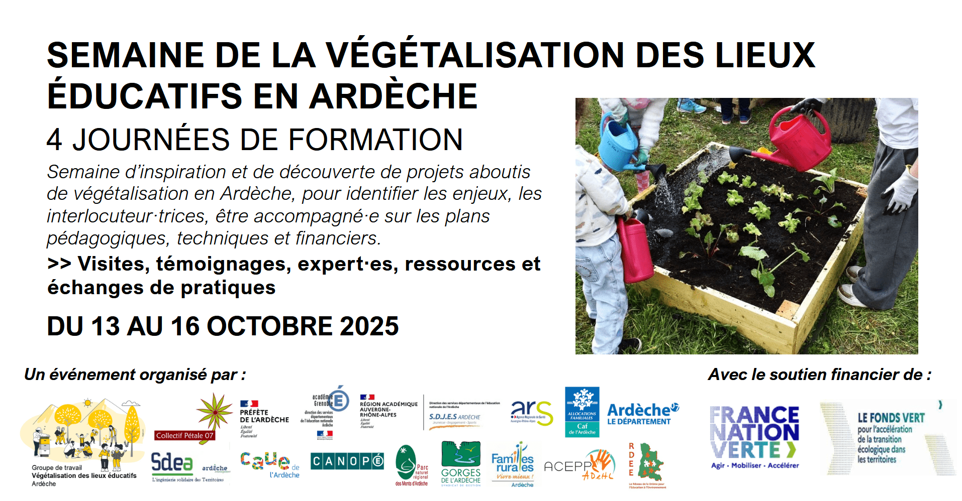 - Ateliers de découverte : enjeux de la végétalisation, rencontre avec les partenaires du Groupe de travail “Végétalisation des lieux éducatifs en Ardèche et présentation du programme de la semaine