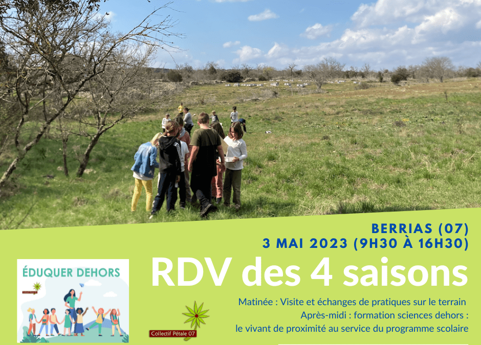 « Rendez-vous des 4 saisons » : Des sciences dehors à toutes les saisons Mercredi 3 mai à l’école publique de Berrias-et-Casteljau Le rdv trimestriel du groupe de travail « Éduquer dehors » Au programme : 9h30-12h30 : Visite & échange de pratiques : à partir du...