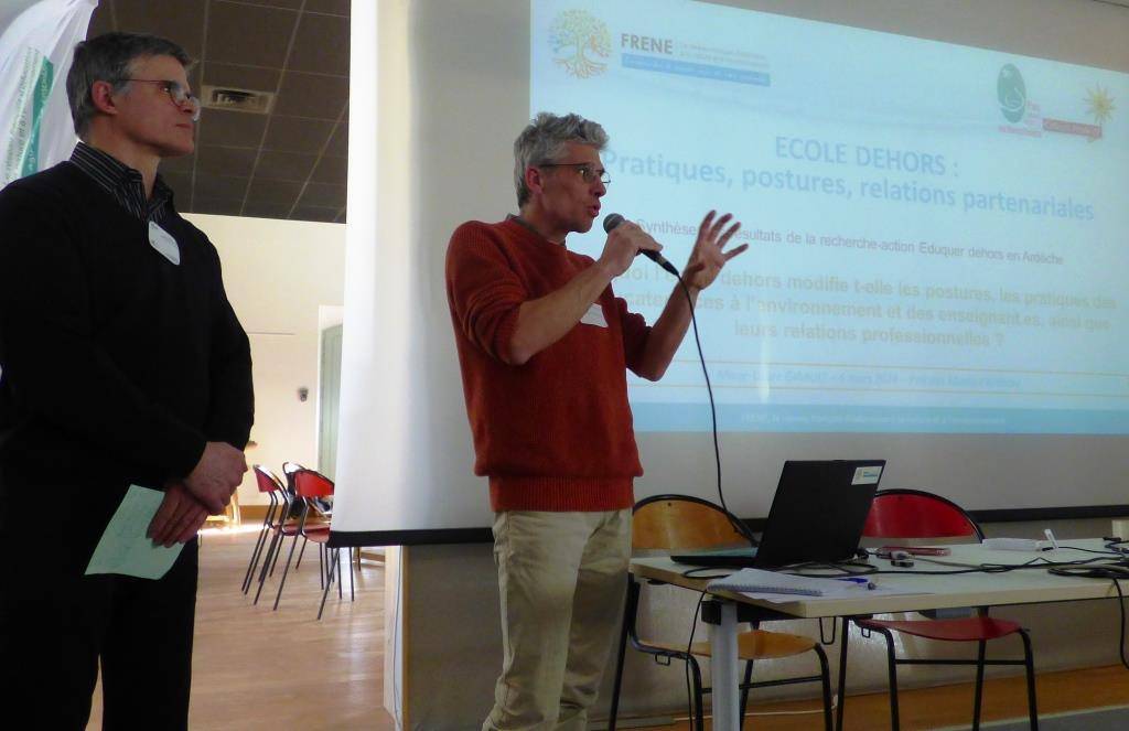 En effet, les écoles de Lentillères avec Karine Plackeel et Ghislaine Morand , Labegude Caroline Noel et Lila Benzid et Jaujac avec Nathalie Demars et Frederic Deronzier ont témoigné de leurs pratiques de la « classe dehors » et du travail en binôme avec les éducateurs à l’environnement. Ils constatent ensemble les effets de cette innovation pédagogique : l’évolution de leurs relations professionnelles, la place de la citoyenneté dans ce type de projet, les temps qui favorisent chez l’enfant la construction de son identité…